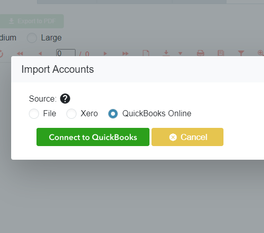 Import financials directly from QuickBooks Online. You can import a Trial Balance or a combination of a Balance Sheet and Income Statement (Profit and Loss). You also have the ability to choose between Accrual or Cash accounting methods.